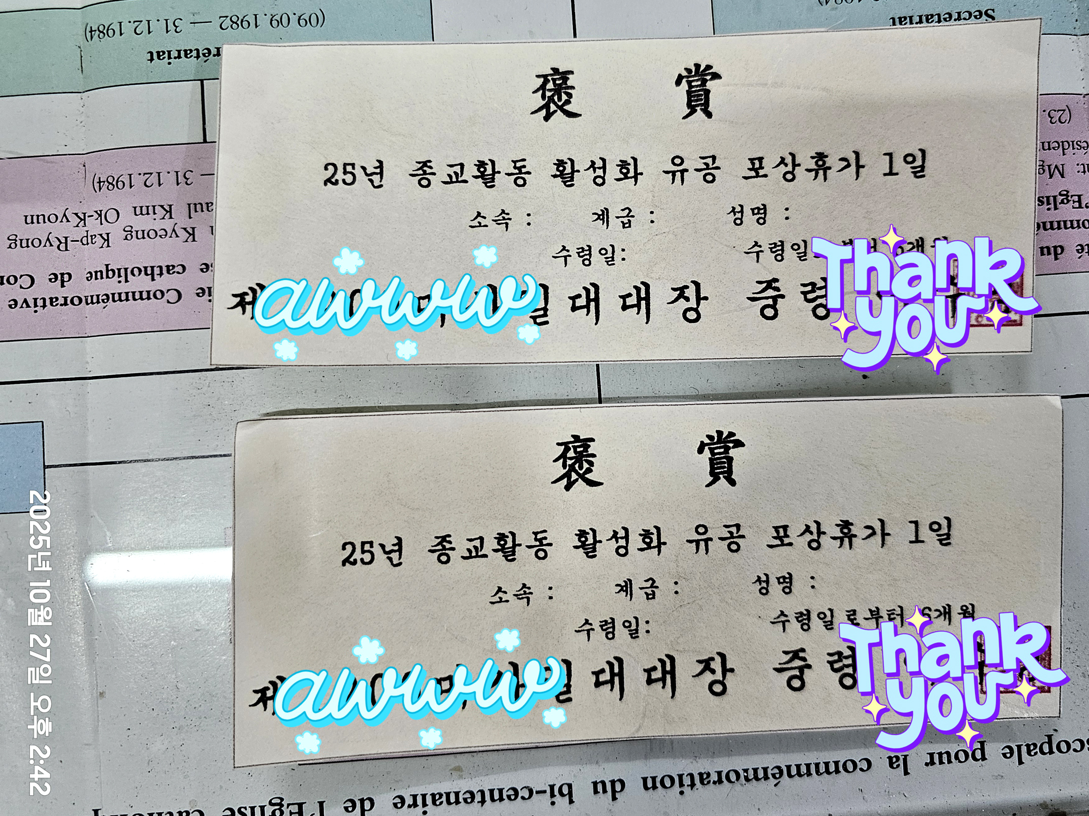 곡수성당 주변 군부대장님(육군 중령)과 수행원 상사님의 곡수성당 변몬시뇰 인사차 예방(2025.10.27). 대대장님은 매주 전우들과 곡수성당 주일 미사 참석을 비롯하여 성실한 종교활동에 2명 병사들에게 1일 포상 휴가증을 변 몬시뇰에게 전달하셨다.