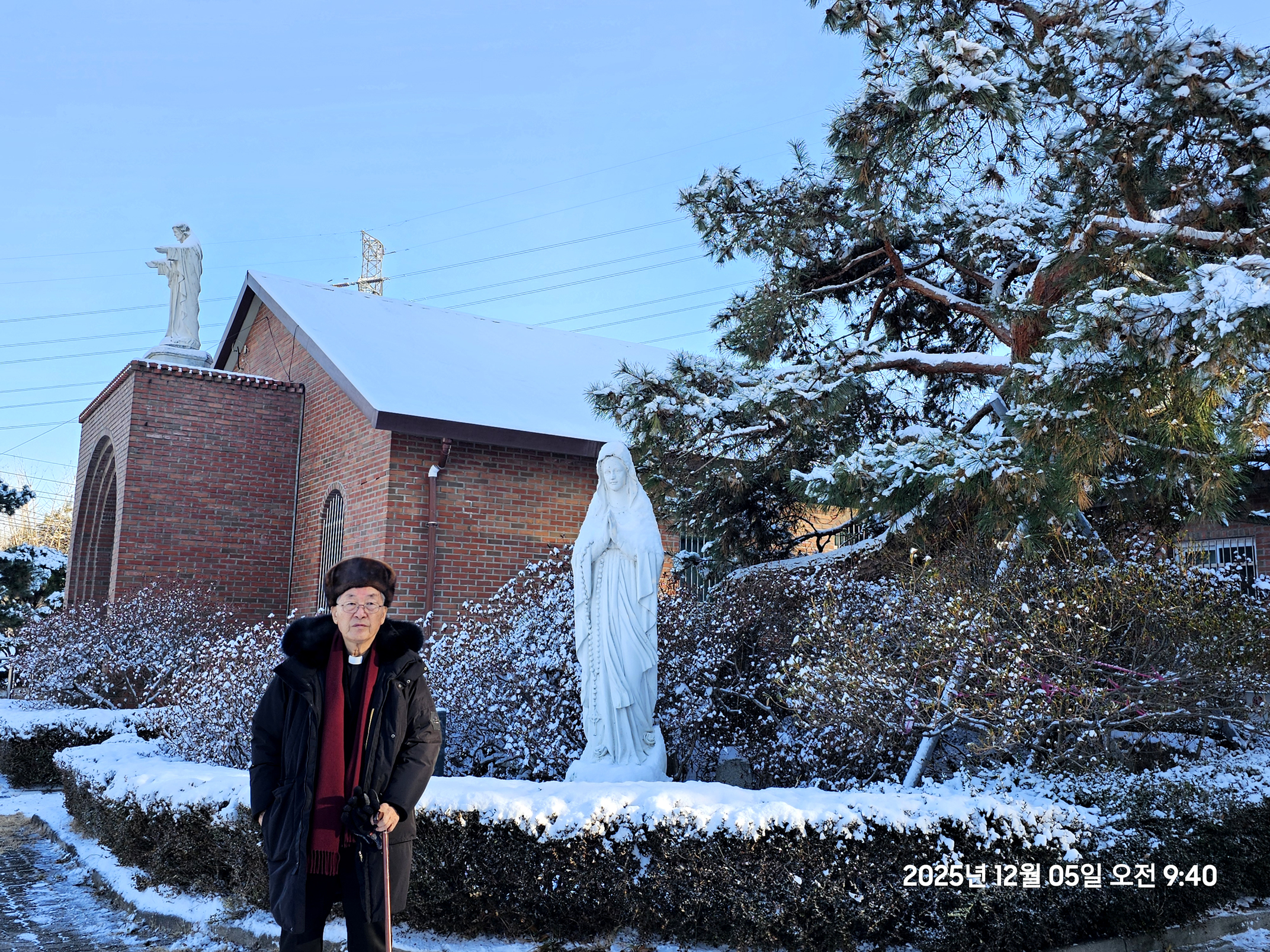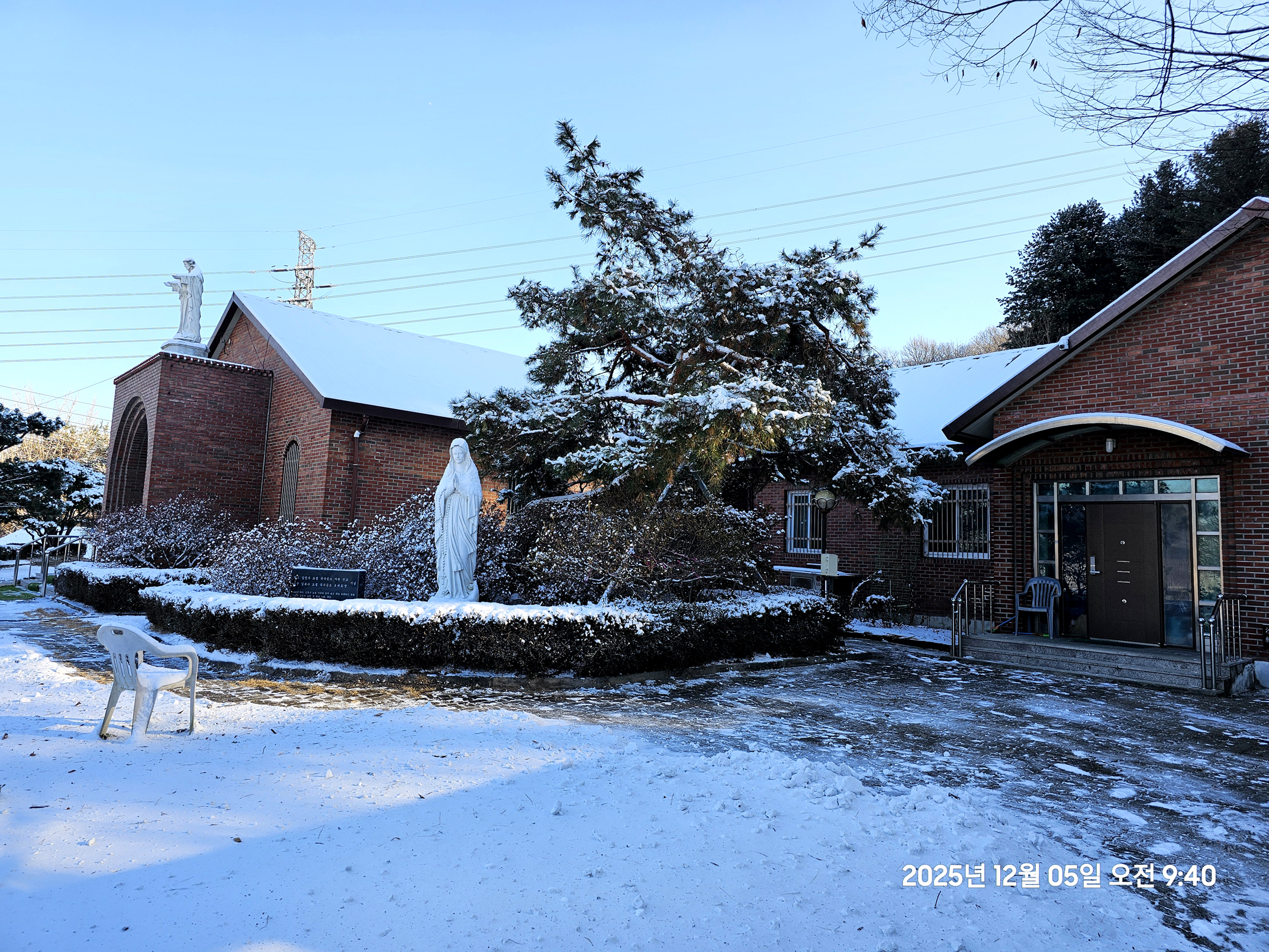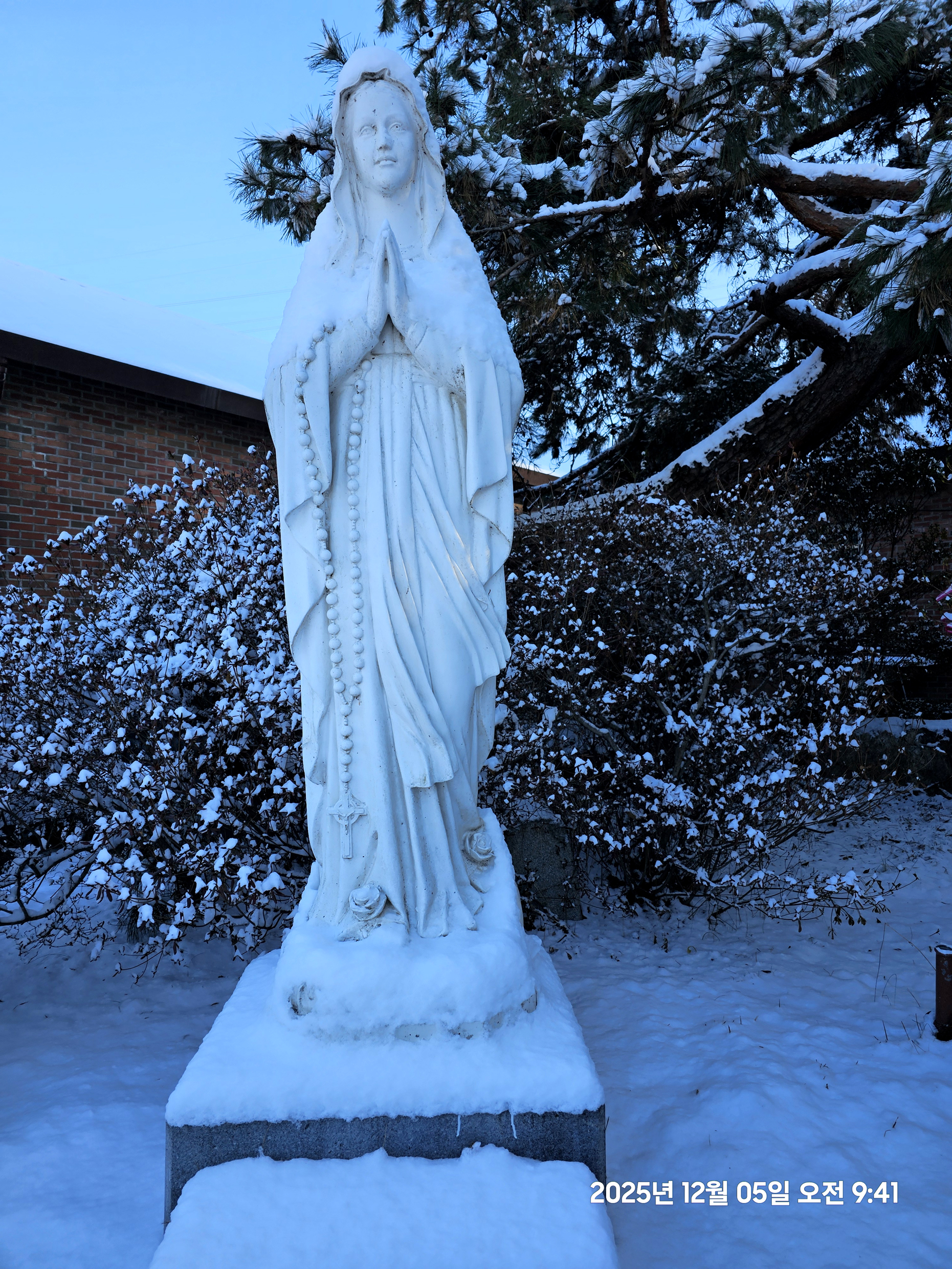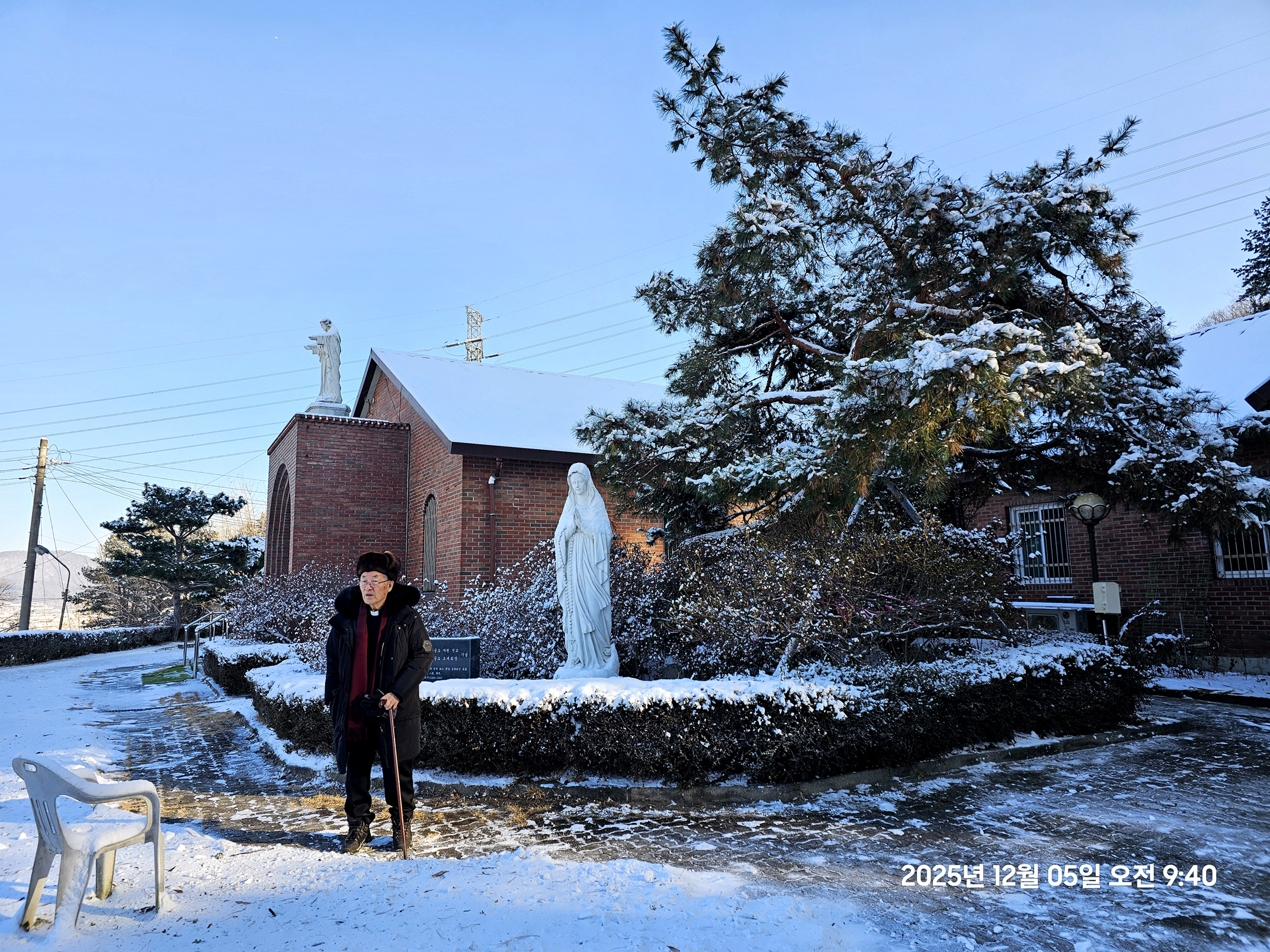 곡수공소 성당에 내리는 금년 첫 눈을 머리에 이고 선 성모상 앞에서, 천상 어머님께 따뜻한 커피 한 잔을 드리면서 ...!(2025.12.05)(눈올때마다 제설작업하는 고마운 봉사자 최미카엘 외삼촌)