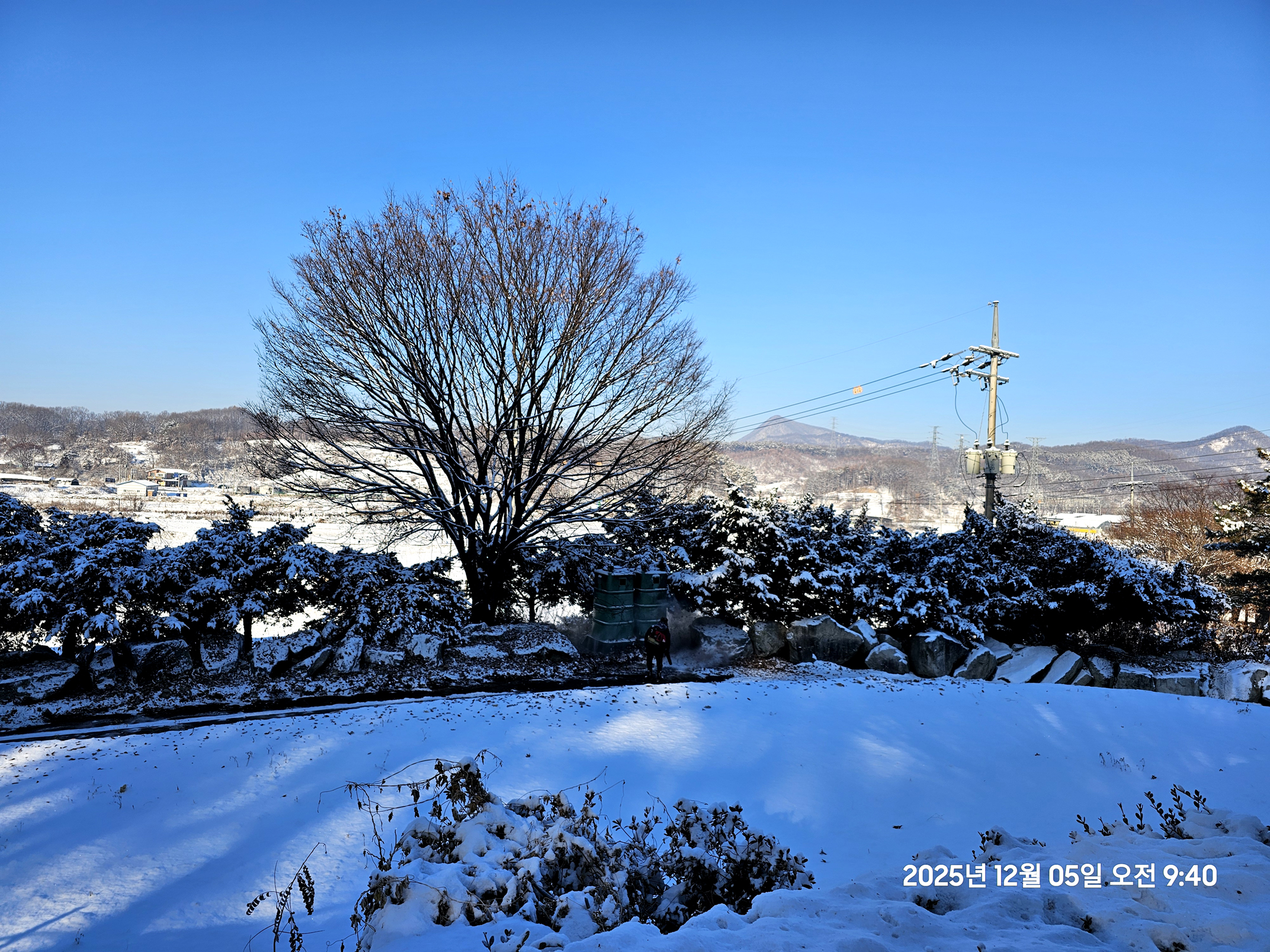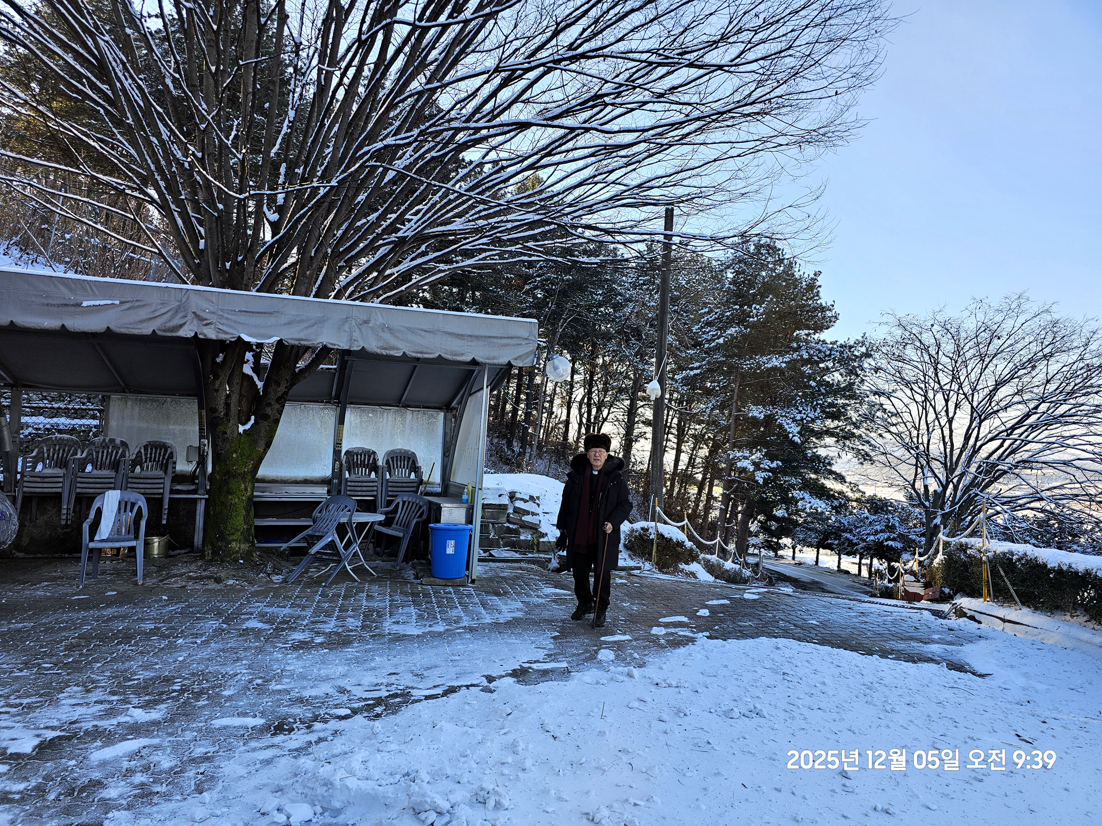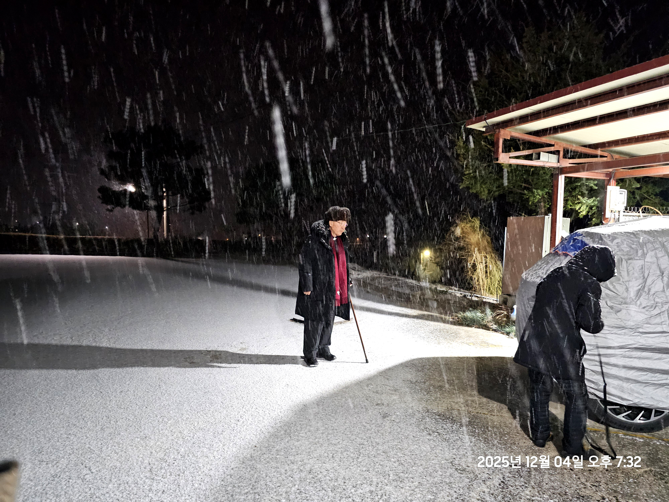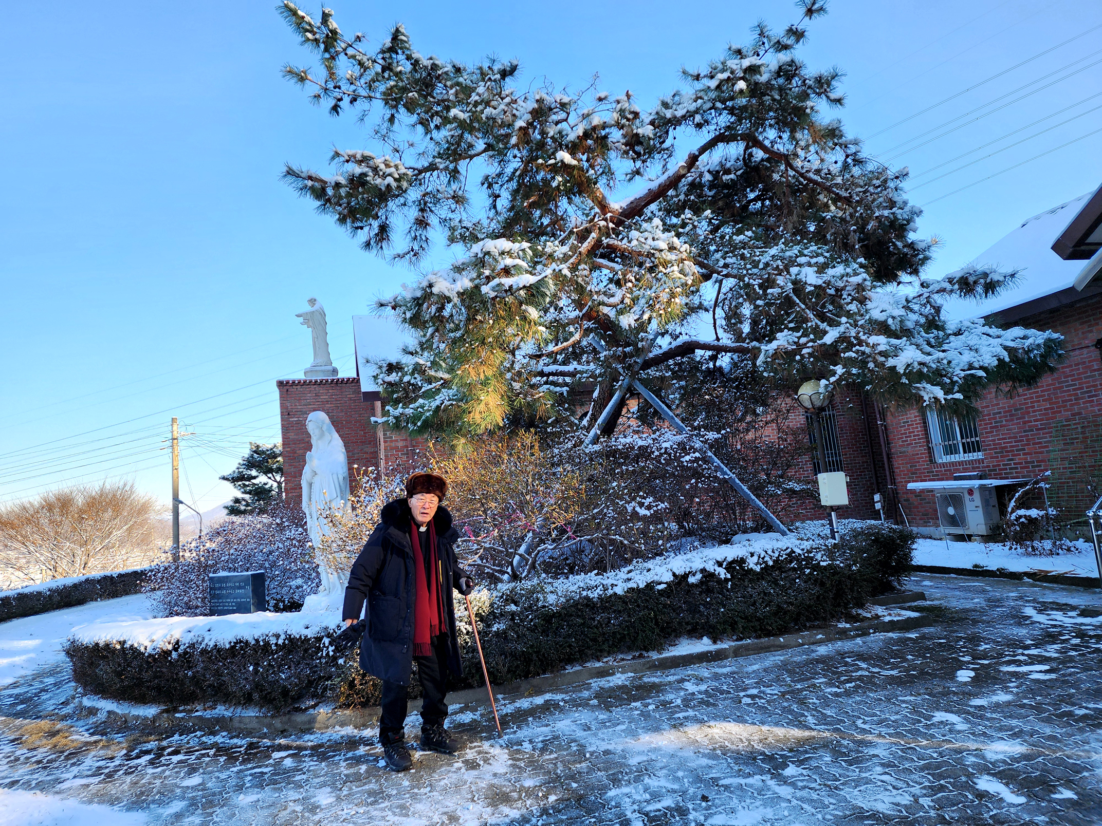 곡수공소 성당에 내리는 금년 첫 눈을 머리에 이고 선 성모상 앞에서, 천상 어머님께 따뜻한 커피 한 잔을 드리면서 ...!(2025.12.05)(눈올때마다 제설작업하는 고마운 봉사자 최미카엘 외삼촌)