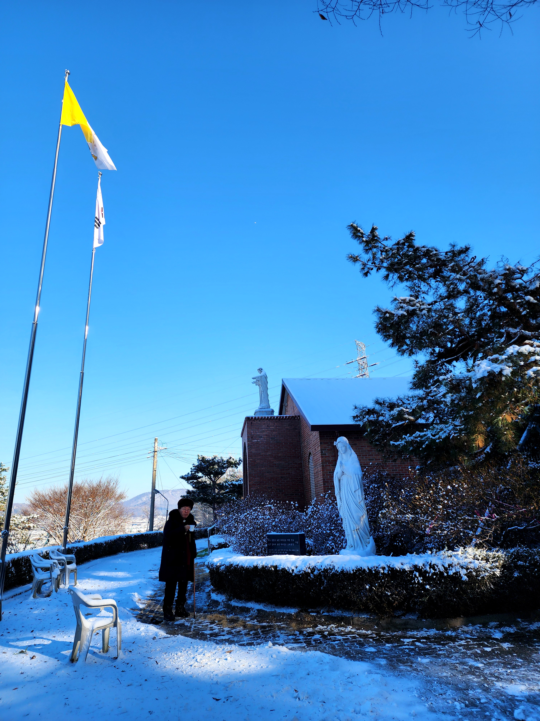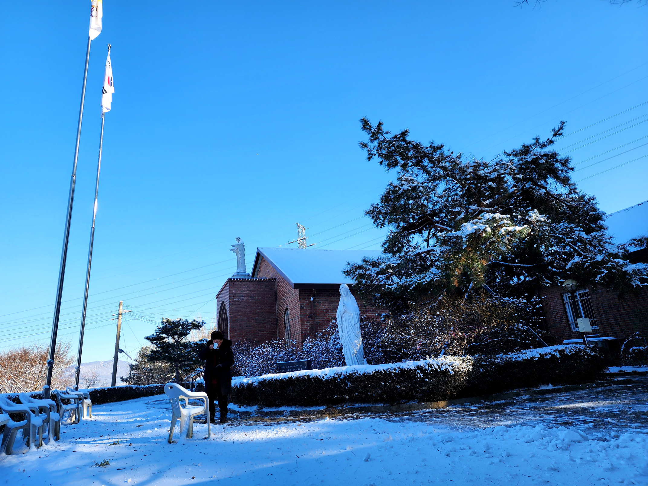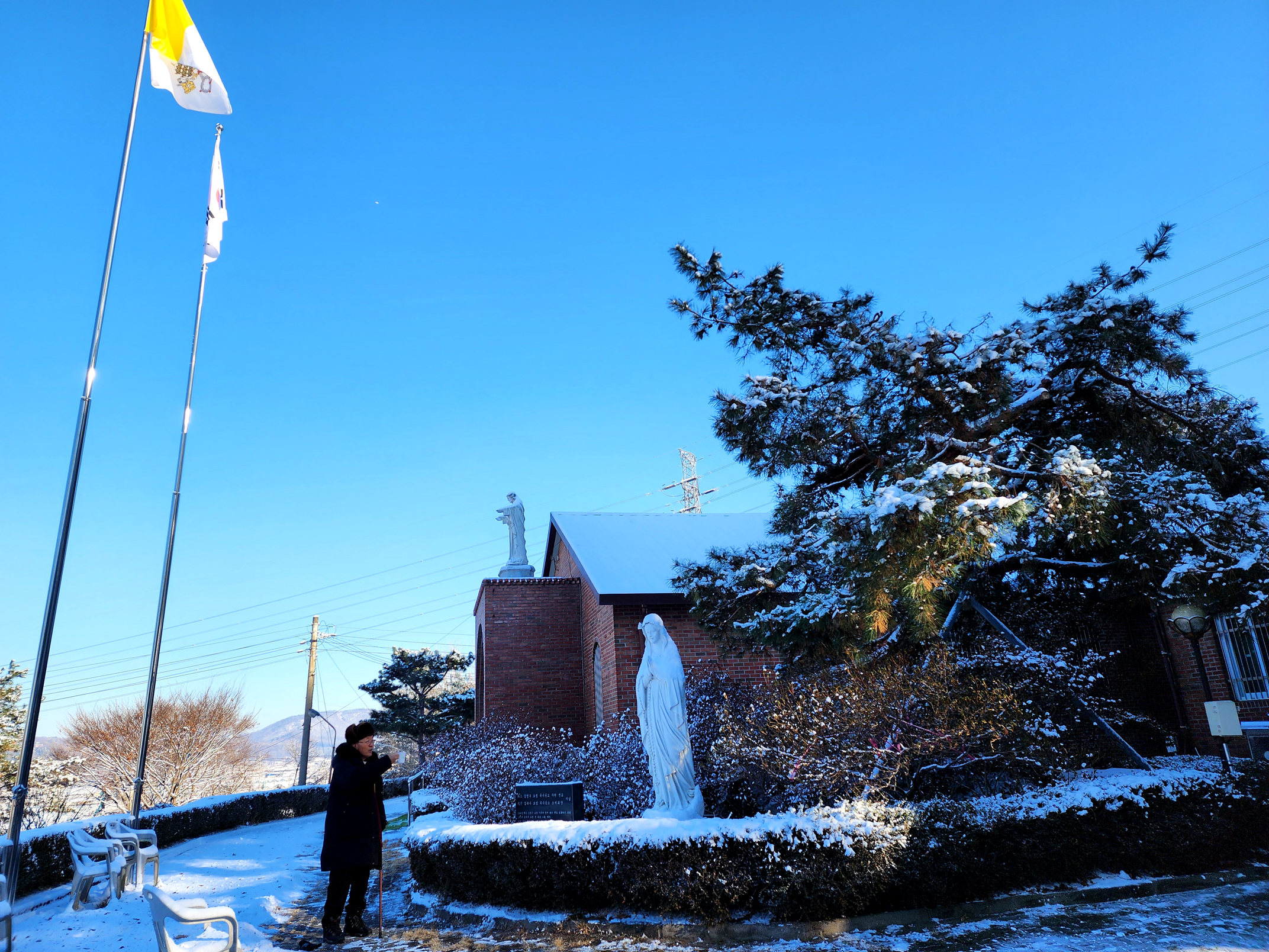 곡수공소 성당에 내리는 금년 첫 눈을 머리에 이고 선 성모상 앞에서, 천상 어머님께 따뜻한 커피 한 잔을 드리면서 ...!(2025.12.05)