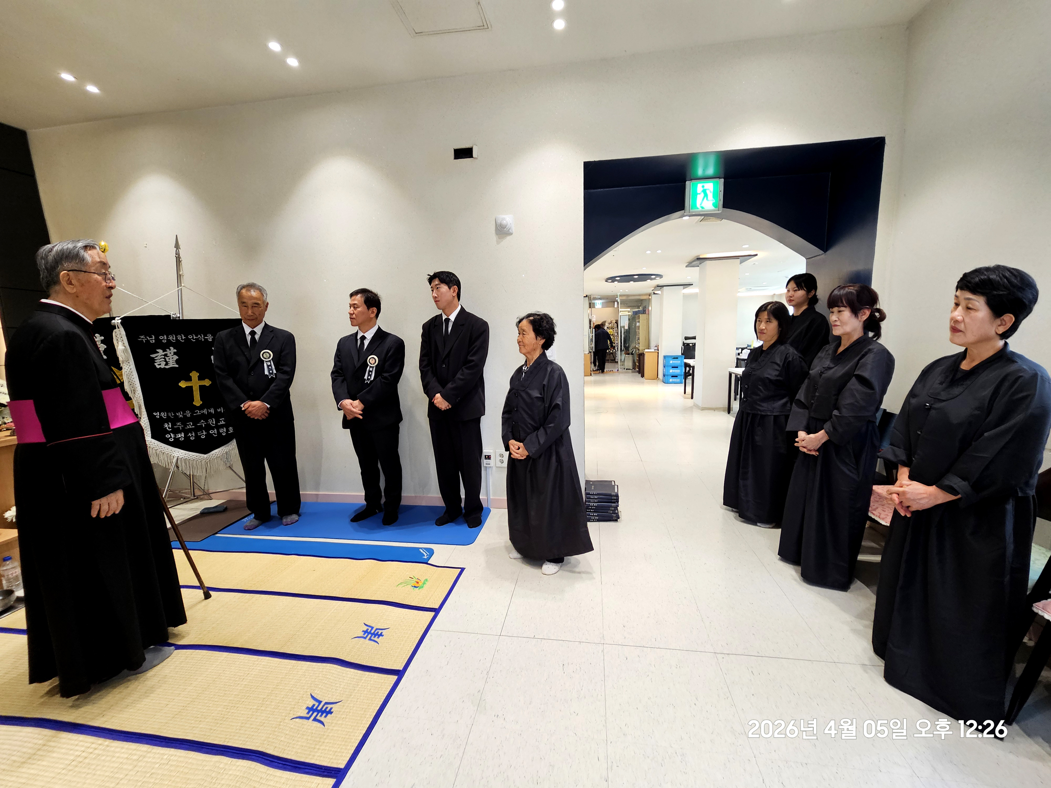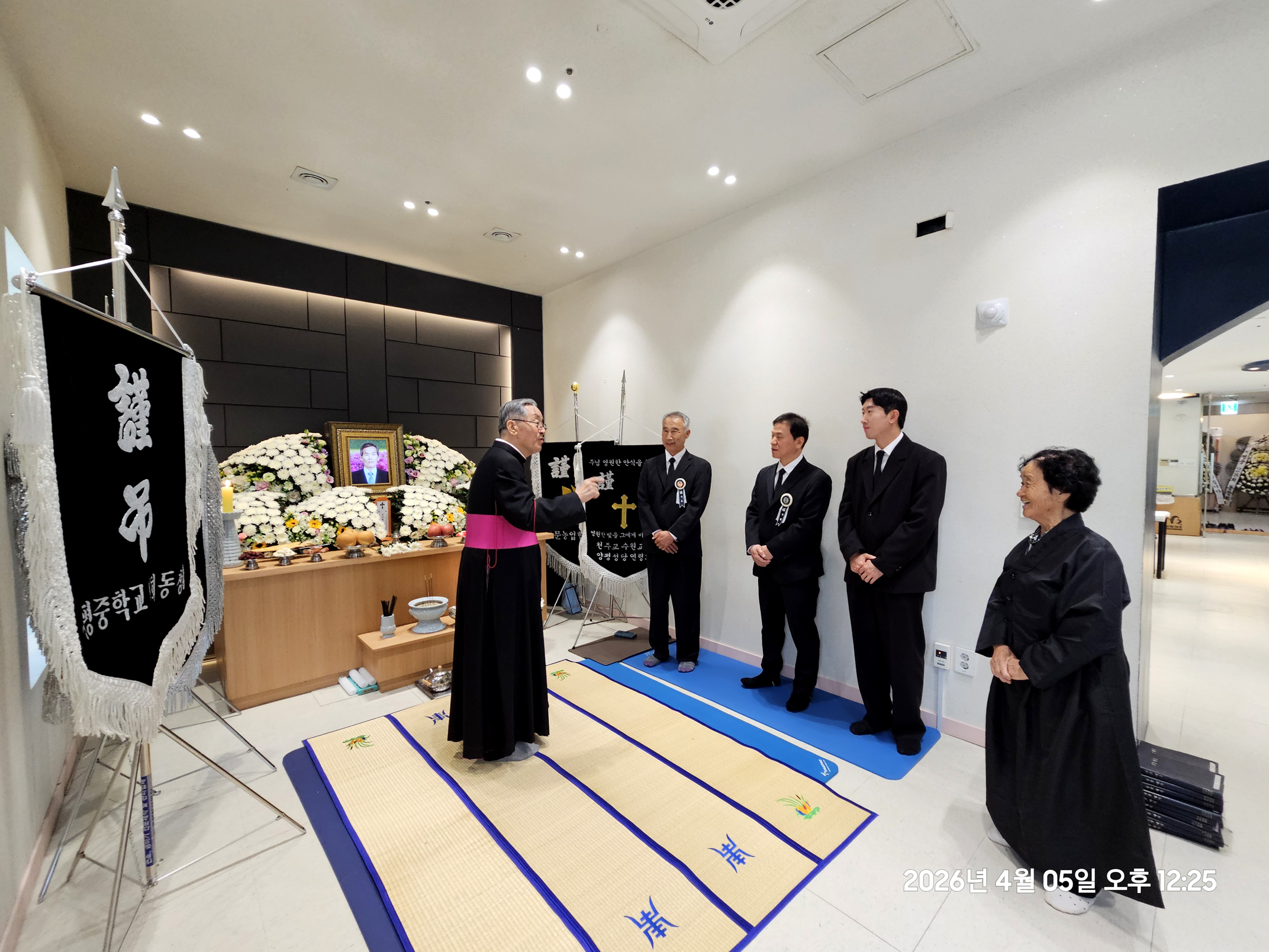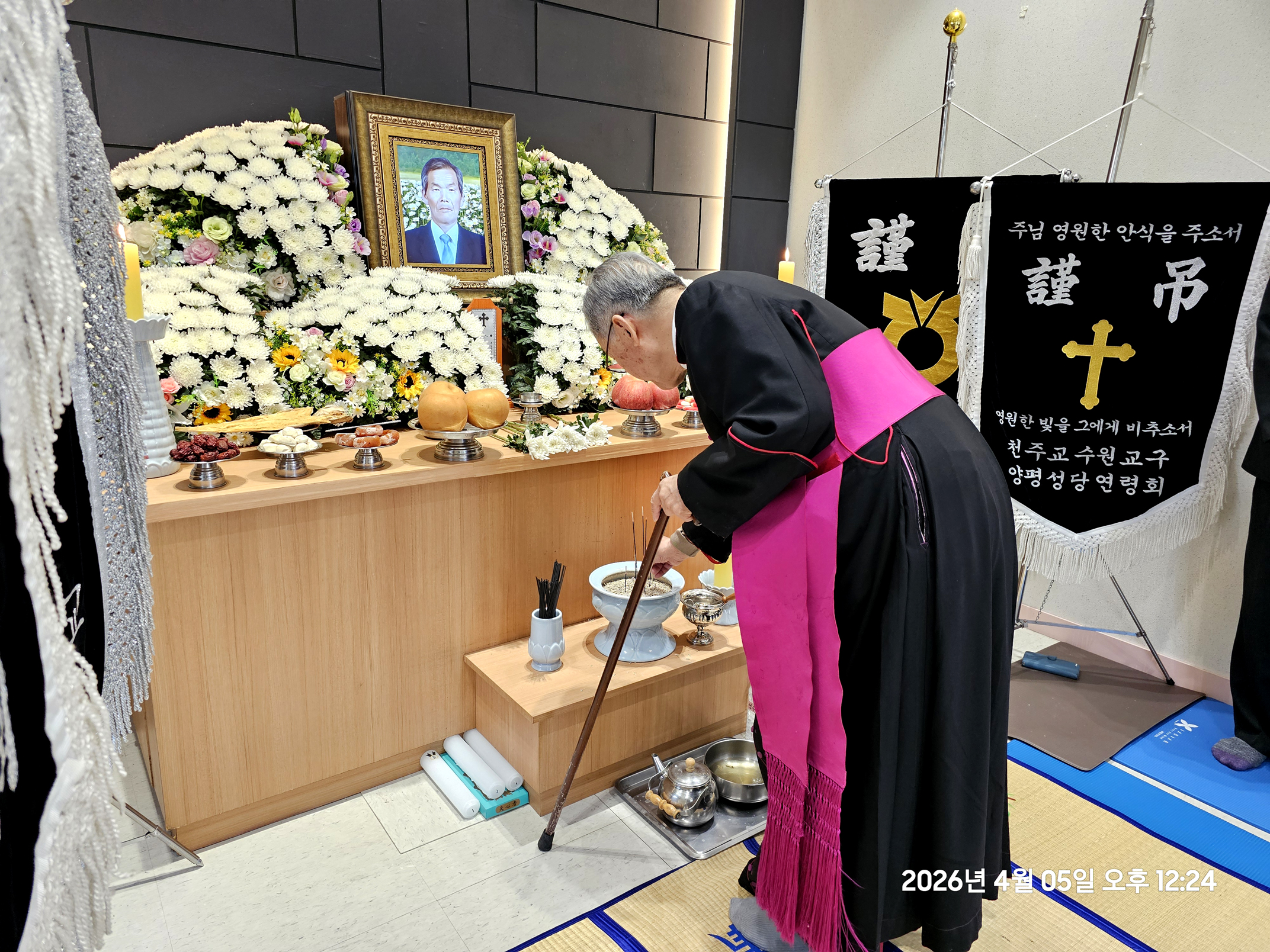 곡수성당, 최고령 유기호 말구(99세) 회장님 선종, 변기영 몬시뇰 문상(2026.04.05. 용문 효병원 장례예식장) 양평본당 곡수리 공소 유기호 마르꼬 할아버지도 토요일 망부활 날 오전 10시 경, 평소 여늬 때와 같이, 간단한 조반을 편히 다 하시고 집에서 쉬시며 서성거리시다가 갑자기 당년 99세로 백수선종(白壽 善終) ! 하셨읍니다. 부인 말찌나 자매님의 정성이 넘치는 복된 간호를 받으시며 말년에 10여년간 걸어서 매주일 오전 10시 이웃 작은 부대의 몇명 안되는 손자들 같은 늠늠한 젊은 병사들과 함께 주일미사를 하셨었는데!