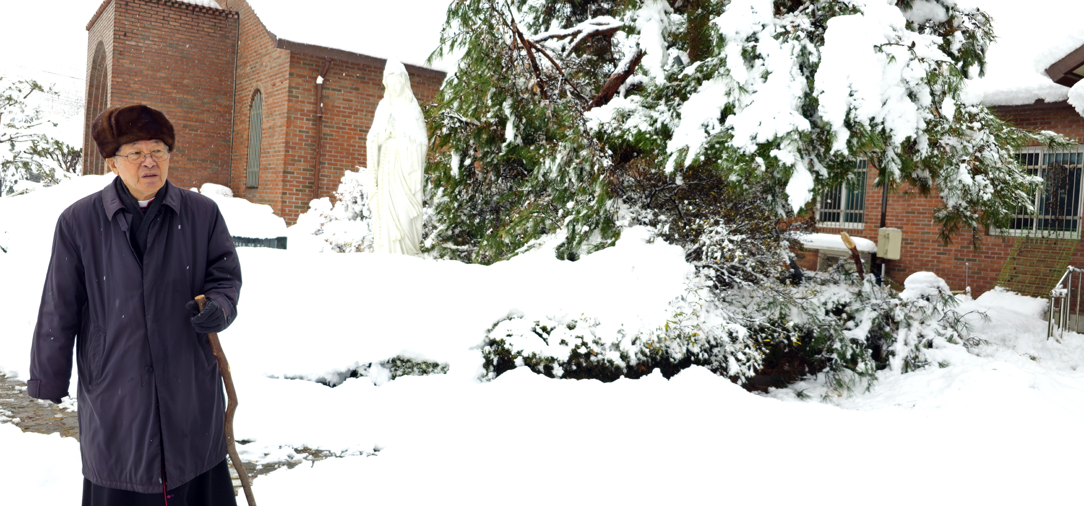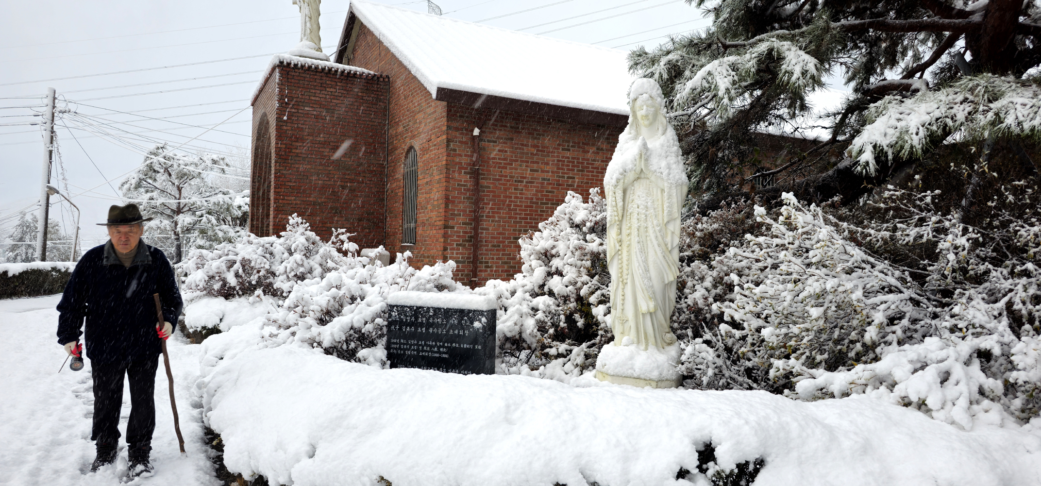 2024년 11월 27일(첫눈),28일 이틀간 50cm의 폭습설로 성모상이 15도 이상 앞으로 기울어짐(2024.11.27-28)(2024.11.27.15cm)