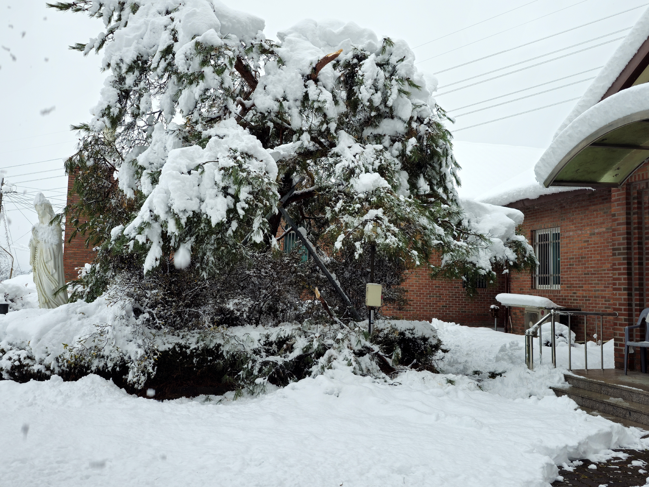 2024년 11월 27일(첫눈),28일 이틀간 50cm의 폭습설로 성모상이 15도 이상 앞으로 기울어짐(2024.11.27-28)(2024.11.28.30cm)
