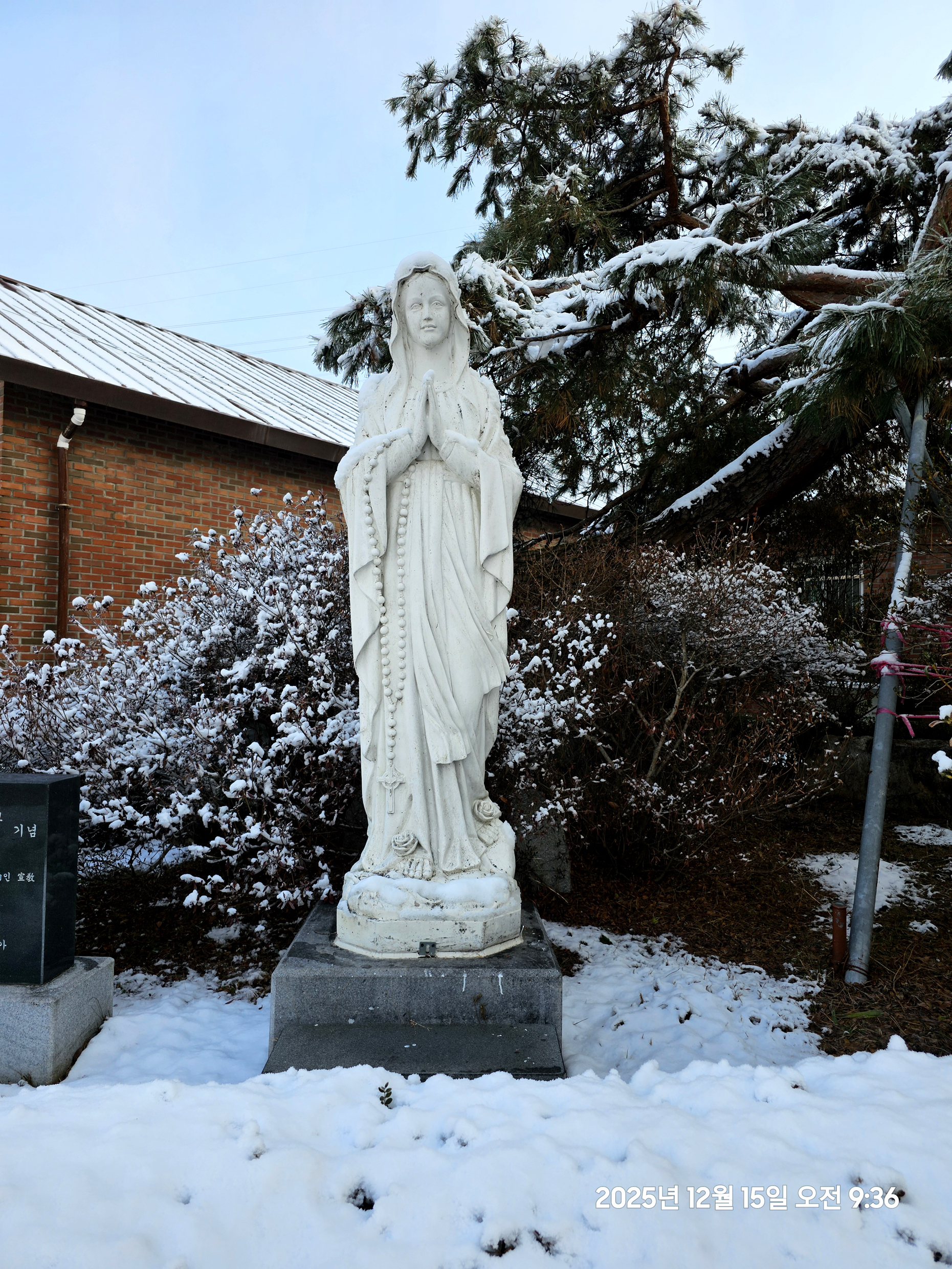 곡수공소 성당에 내리는 금년 첫 눈을 머리에 이고 선 성모상 앞에서, 천상 어머님께 따뜻한 커피 한 잔을 드리면서 ...!(2025.12.05)