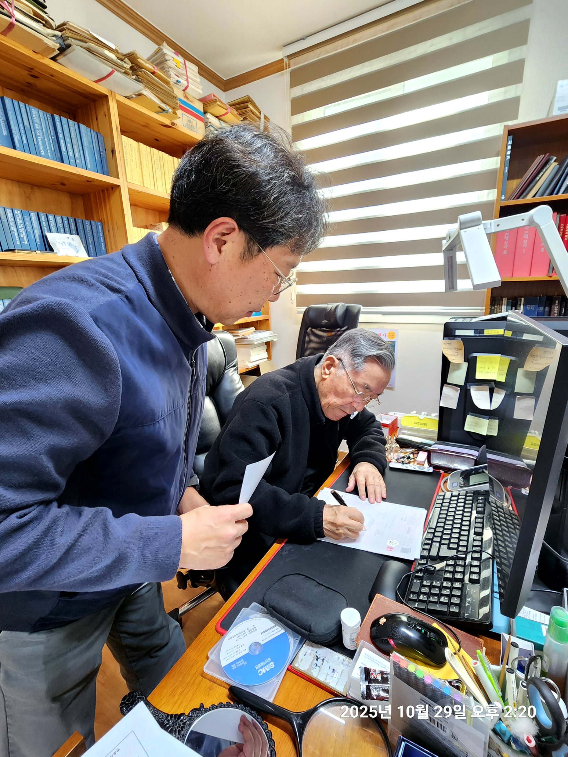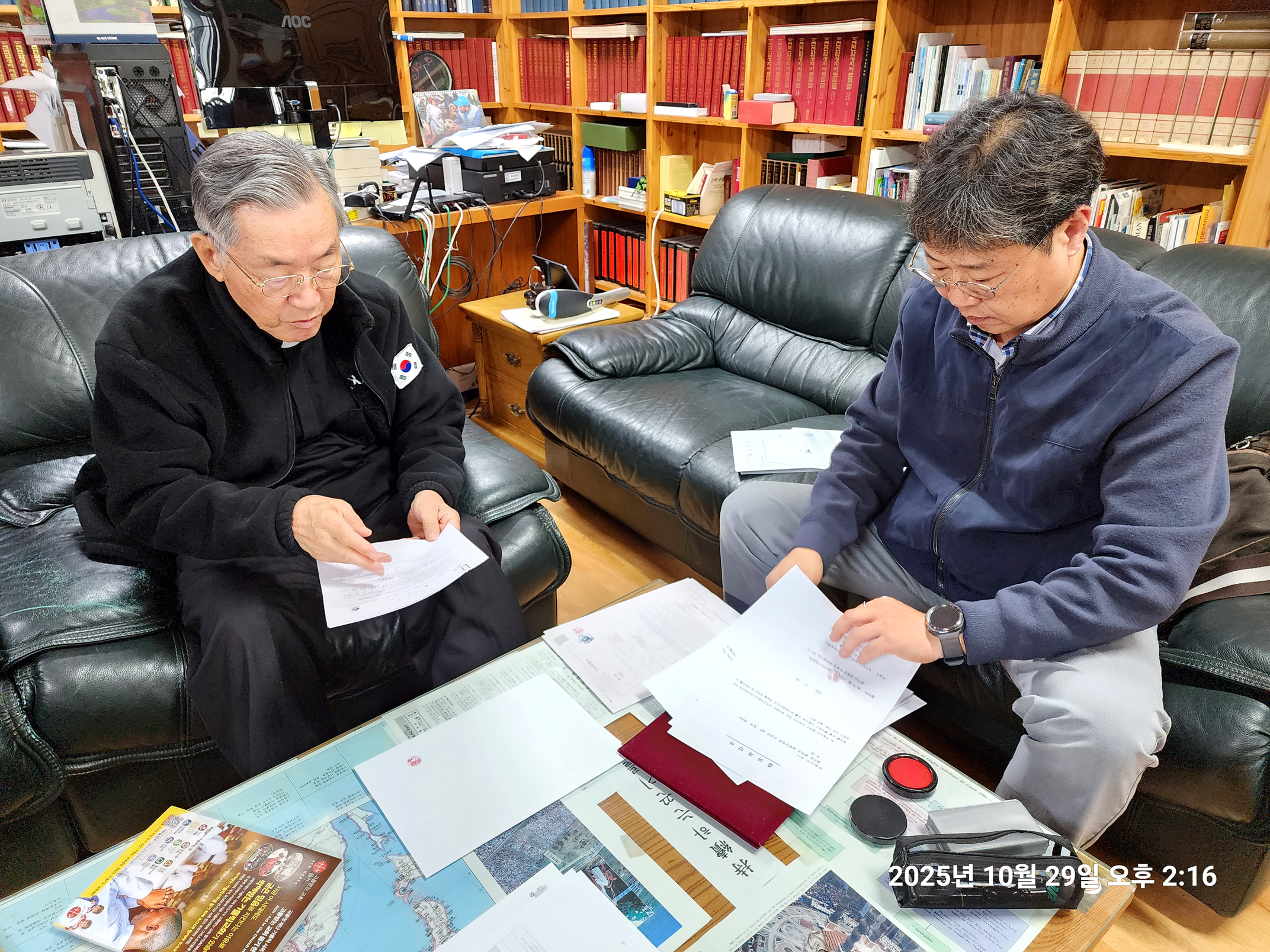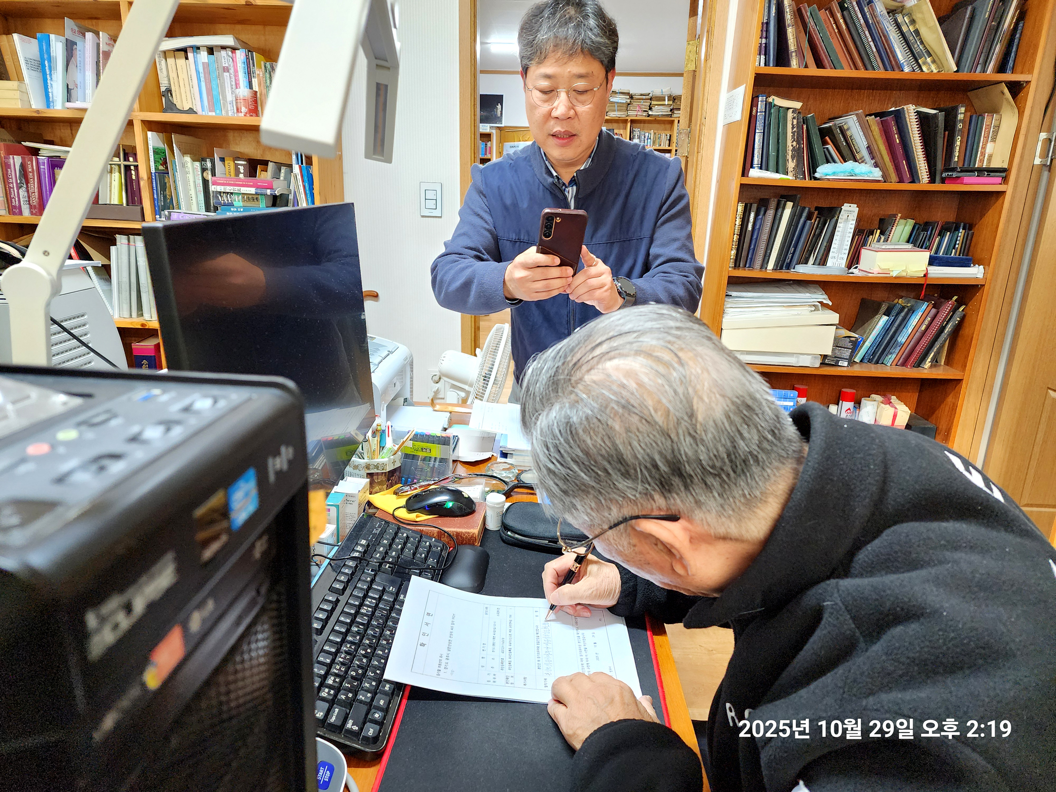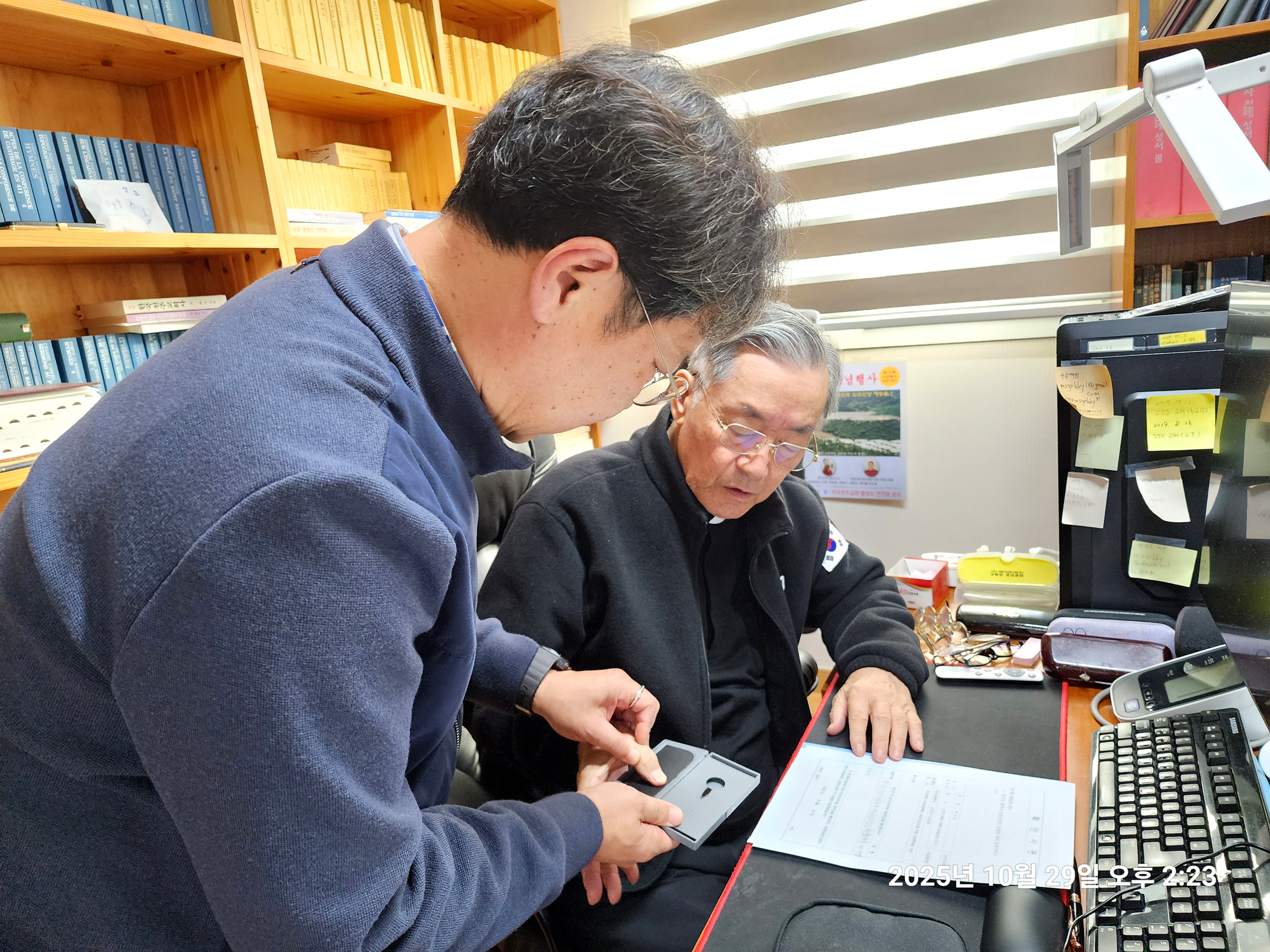 변기영 몬시뇰 명의로 되어 50 여년 째 안 넘어가고 남아 있던 남한산성 순교성지 3천 여평 토지(지목,전) 마지막 1필지가 마침내 교구 명의로 이전차,교구 법인과 정영택 팀장이 광주시 허락을 받아,곡수 공수로 내방,인감 이전 서류를 받아가는 모습(2025.10.29. 오후 2시).