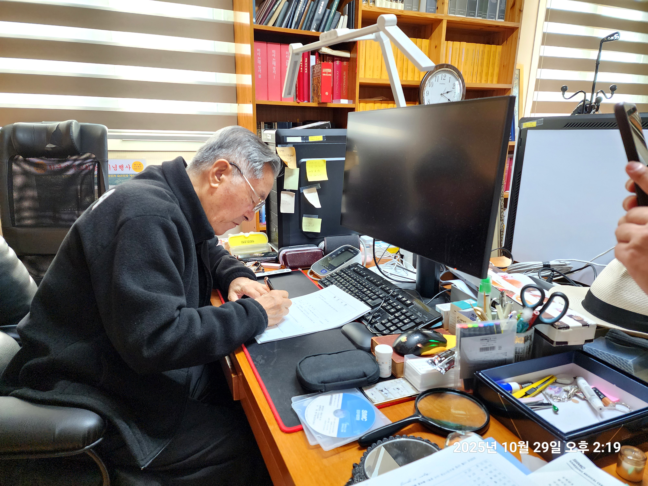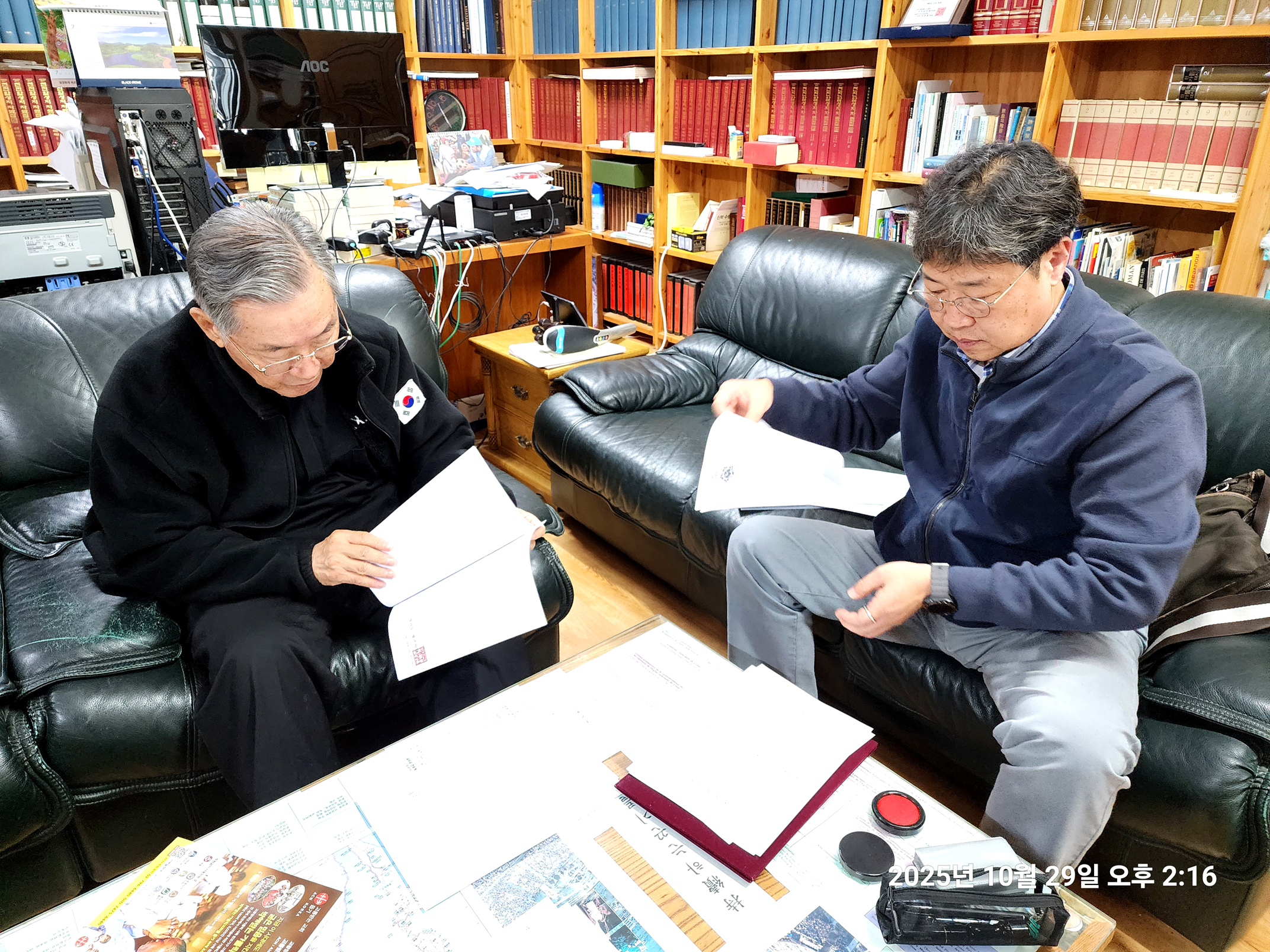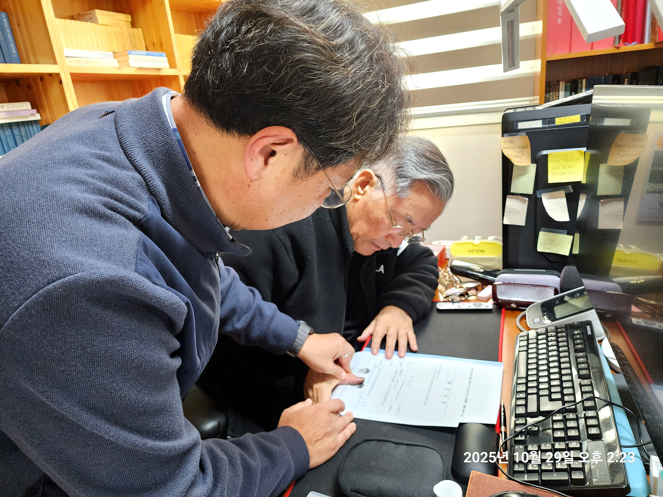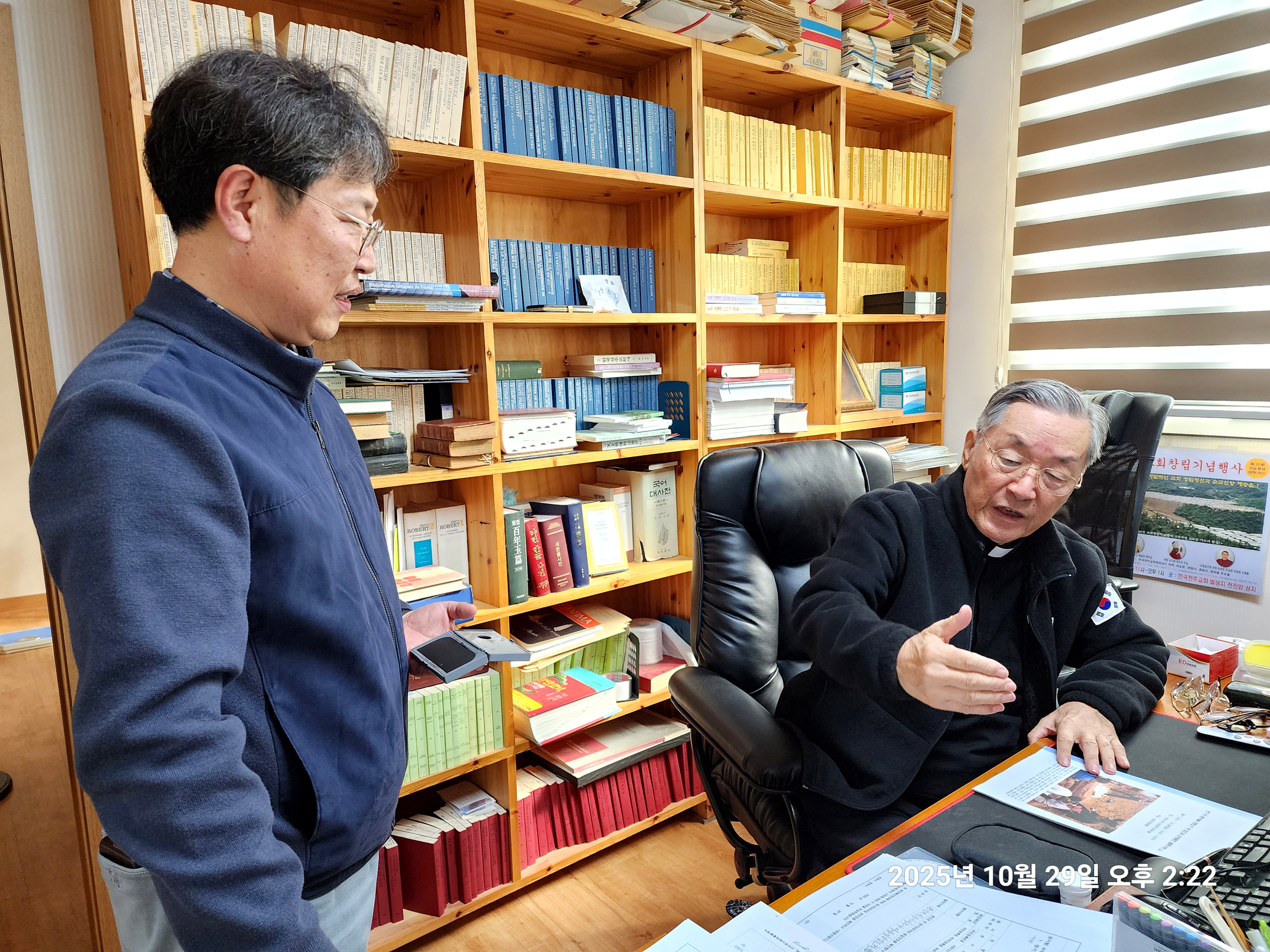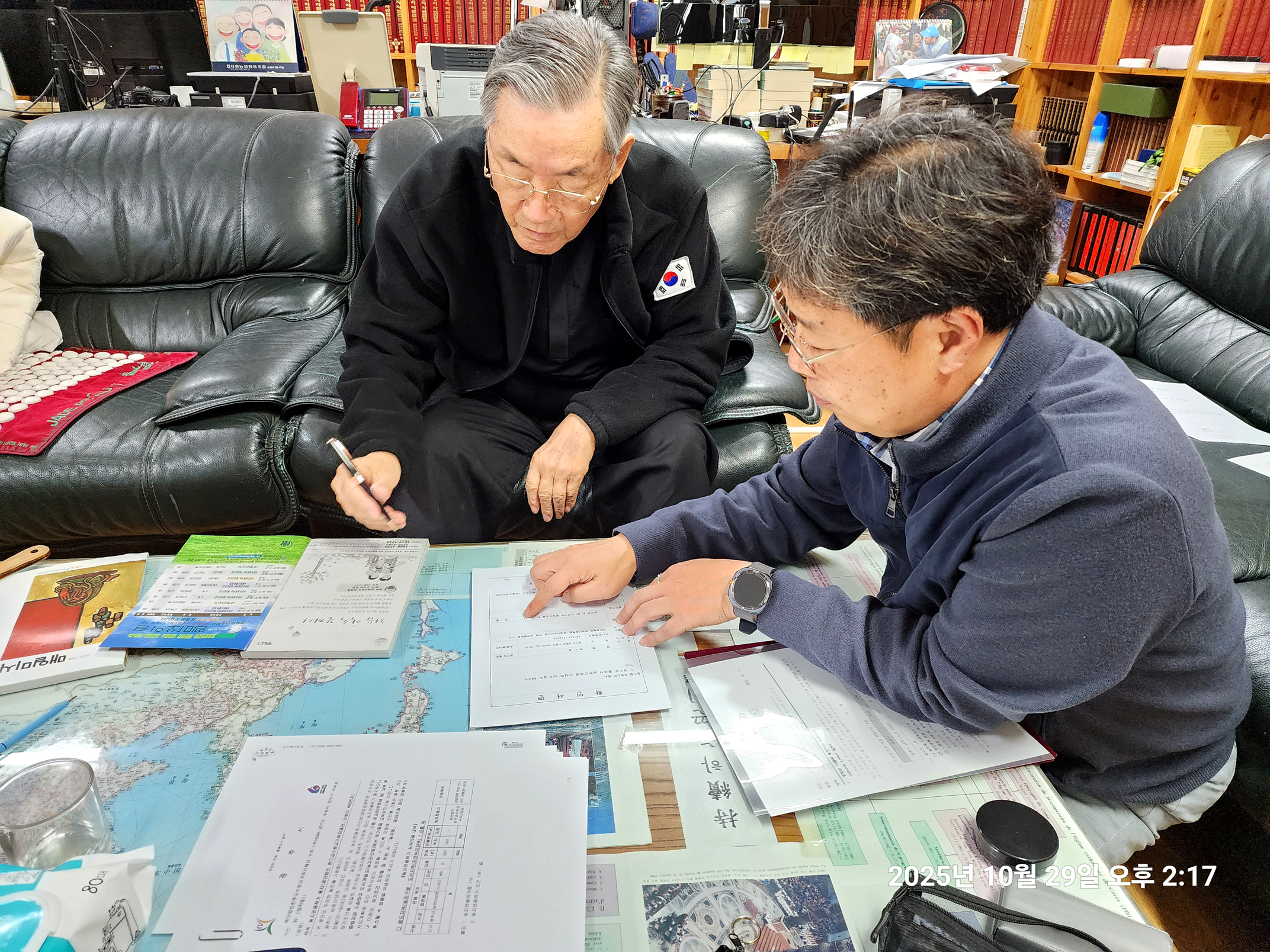 변기영 몬시뇰 명의로 되어 50 여년 째 안 넘어가고 남아 있던 남한산성 순교성지 3천 여평 토지(지목,전) 마지막 1필지가 마침내 교구 명의로 이전차,교구 법인과 정영택 팀장이 광주시 허락을 받아,곡수 공수로 내방,인감 이전 서류를 받아가는 모습(2025.10.29. 오후 2시).