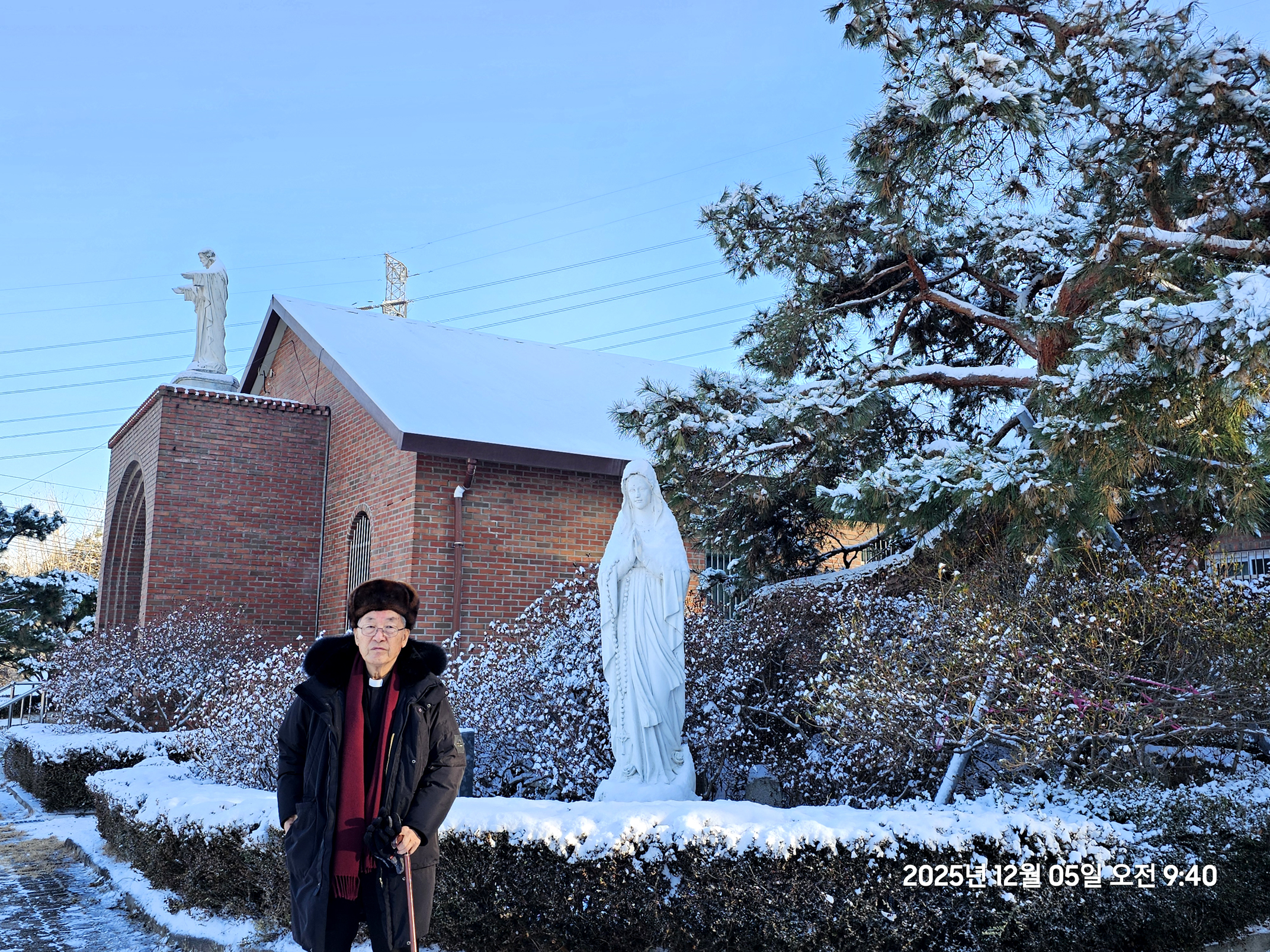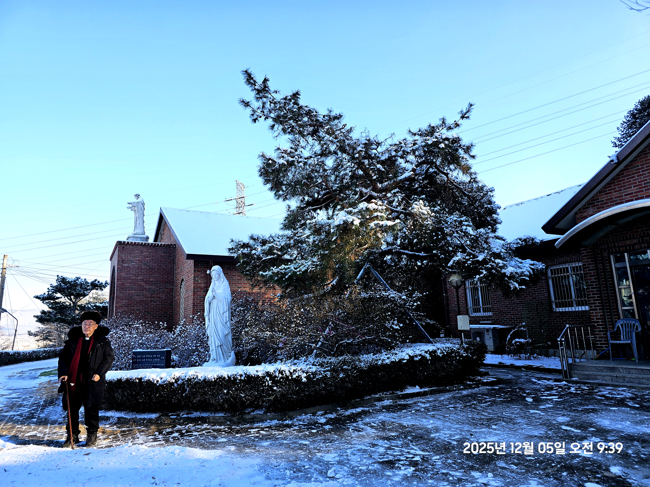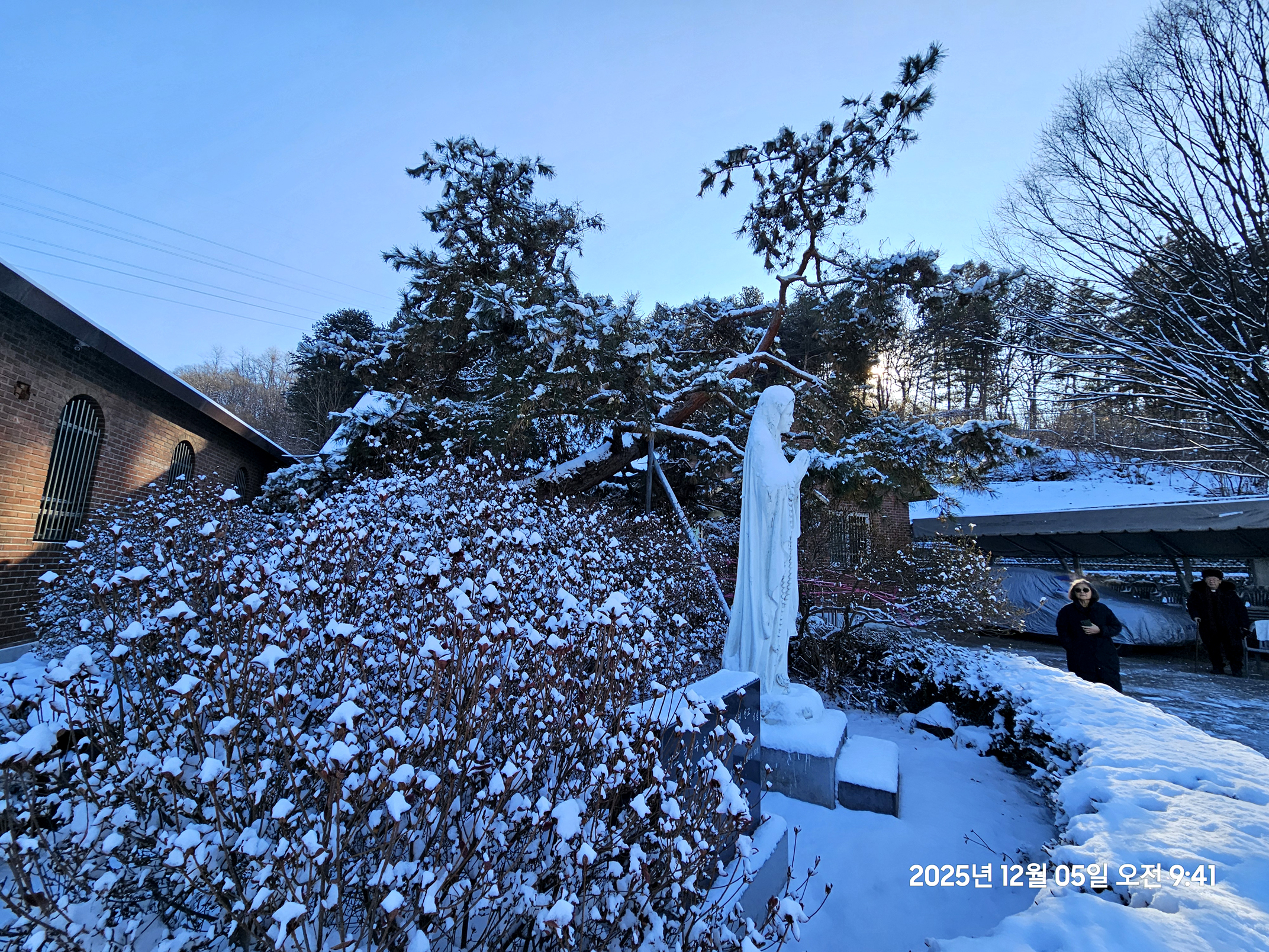 곡수공소 성당에 내리는 금년 첫 눈을 머리에 이고 선 성모상 앞에서, 천상 어머님께 따뜻한 커피 한 잔을 드리면서 ...!(2025.12.05)(눈올때마다 제설작업하는 고마운 봉사자 최미카엘 외삼촌)