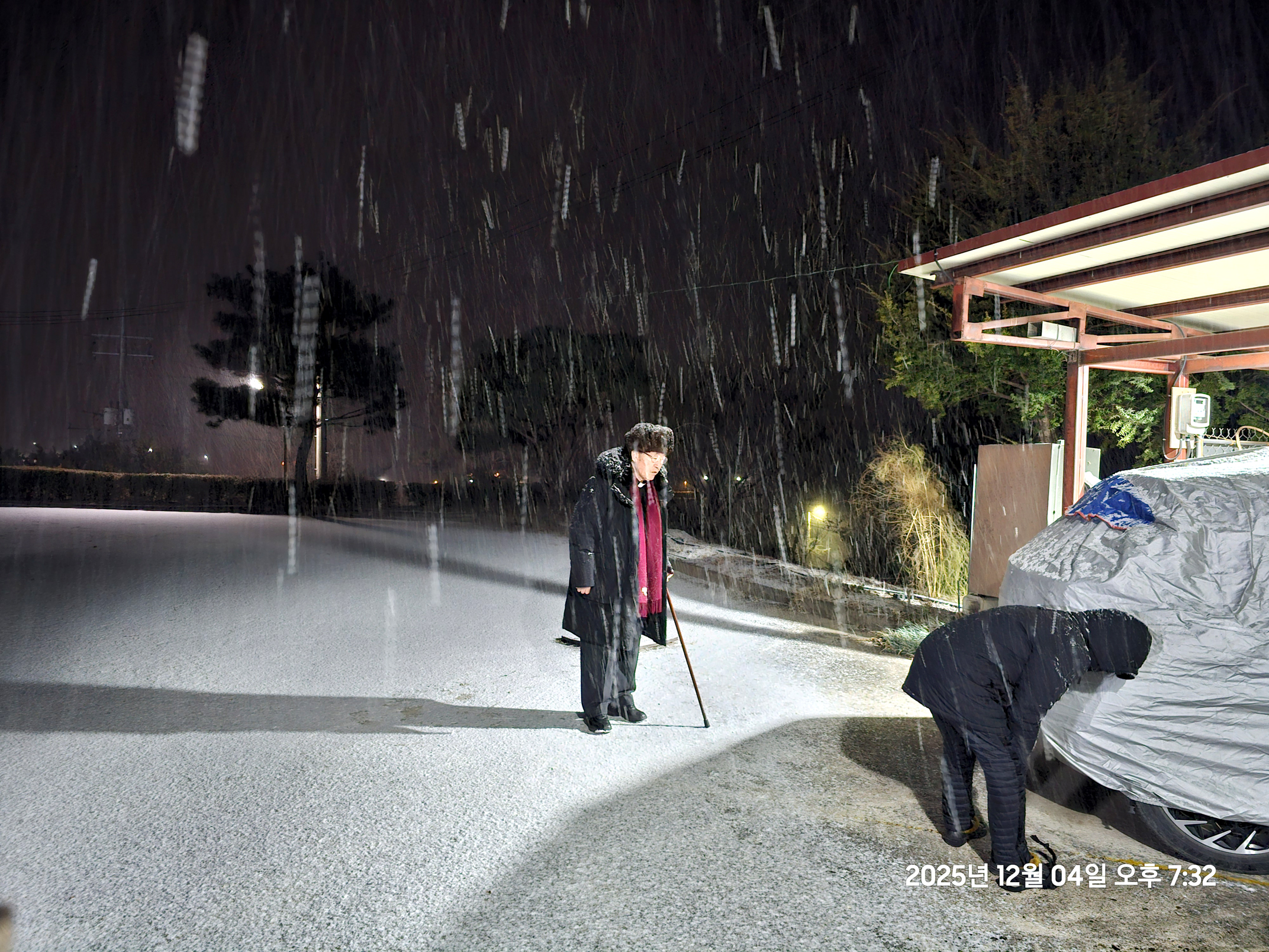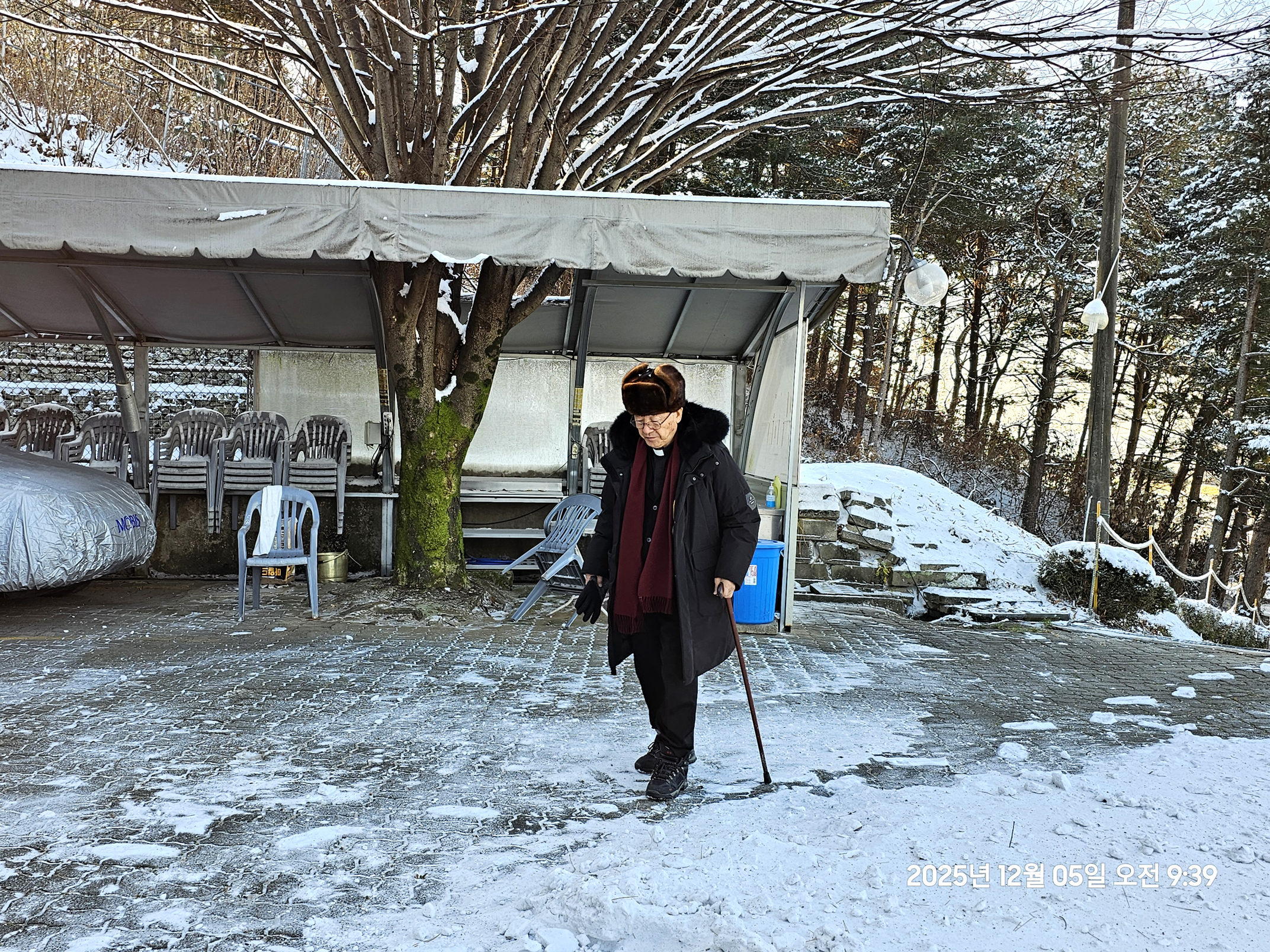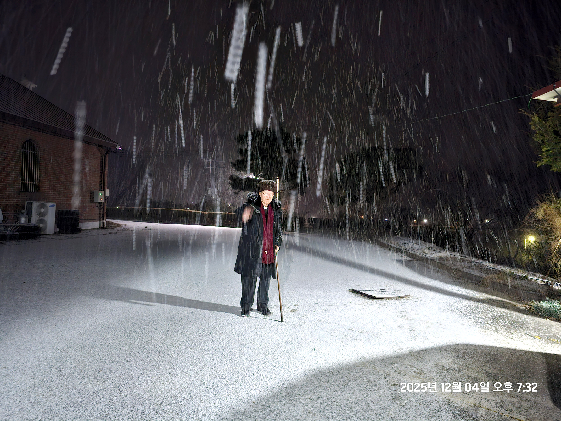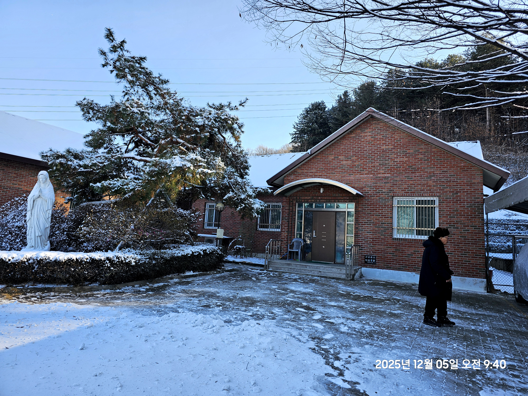곡수공소 성당에 내리는 금년 첫 눈을 머리에 이고 선 성모상 앞에서, 천상 어머님께 따뜻한 커피 한 잔을 드리면서 ...!(2025.12.05)(눈올때마다 제설작업하는 고마운 봉사자 최미카엘 외삼촌)